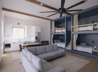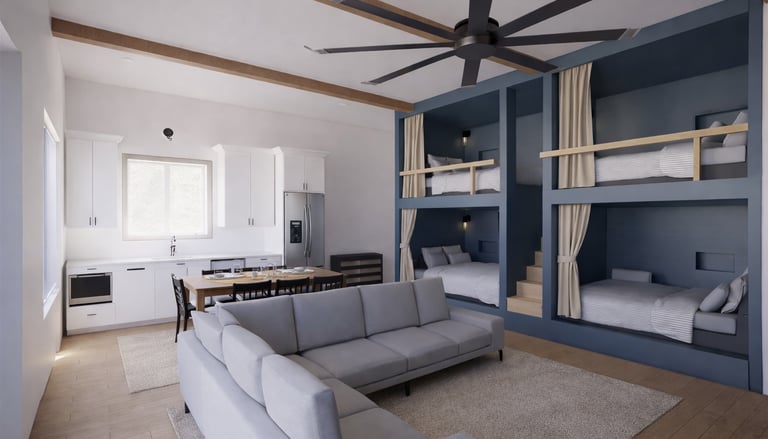 The Great Room in the Bunk House features two luxurious queen-over-queen bunk beds with built-in stairs for easy access. Each sleeping space is outfitted with room-darkening curtains, creating a cozy, private retreat for restful nights. (Note: Picture is a rendering, final decor may differ, construction underway, available May 1st).