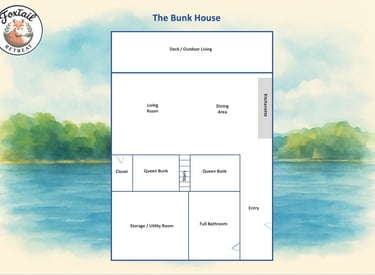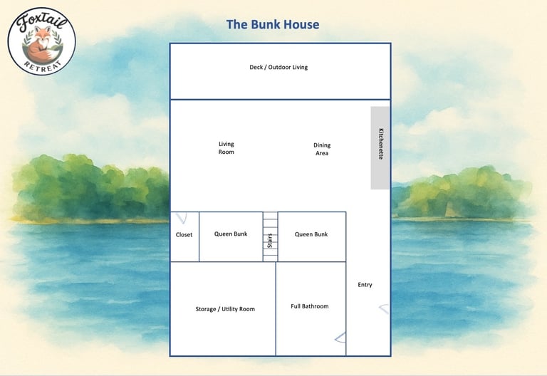 With 4 beautifully appointed bedrooms and 6 total beds in the Main House and an additional 4 Queen beds in the Bunk House, FoxTail Retreat offers peaceful sleep for up to 18 guests. Each room is designed with comfort in mind — from plush mattresses and soft linens to nature sound maker and other, nature-inspired touches. Whether you’re unwinding after a day on the lake or settling in for a cozy night with loved ones, you’ll find every space crafted for deep rest and relaxation.