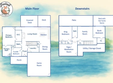 The Main House is the heart of FoxTail Retreat, featuring open living, dining, and kitchen spaces that flow to covered and open decks. With a primary suite, trundle bedroom, game room, and thoughtful layout, it’s designed for relaxed, effortless group stays.